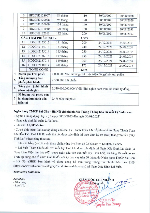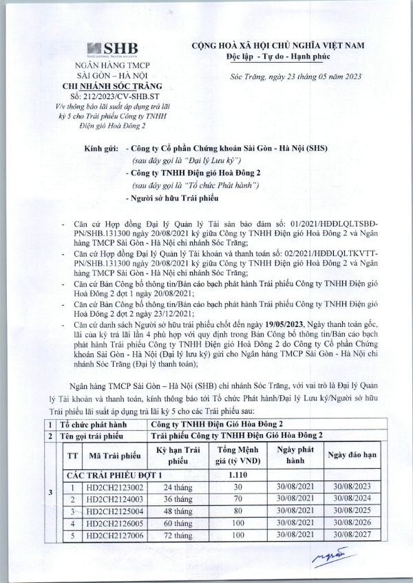 Thông báo lãi suất Trái phiếu Công ty TNHH Điện gió Hoà Đông 2