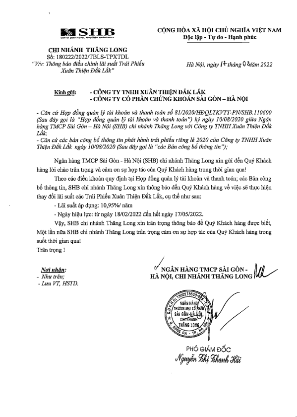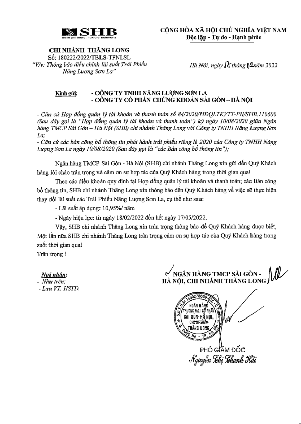 Thông báo lãi suất Trái phiếu Công ty TNHH Năng Lượng Sơn La và Trái phiếu Công ty TNHH Xuân Thiện Đắk Lắk từ ngày 18.02.2022 đến 17.05.2022