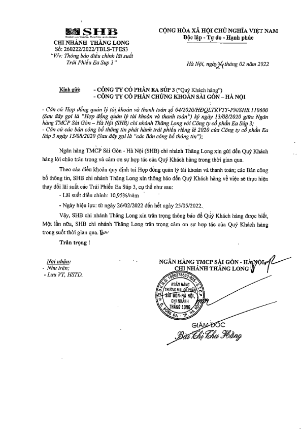 Thông báo lãi suất Trái phiếu CTCP Ea Súp 3 từ 26/02/2022 đến 25/05/2022