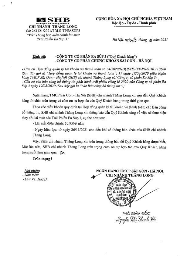 Thông báo Lãi suất Trái phiếu CTCP Ea Súp 3 từ ngày 26/11/2021