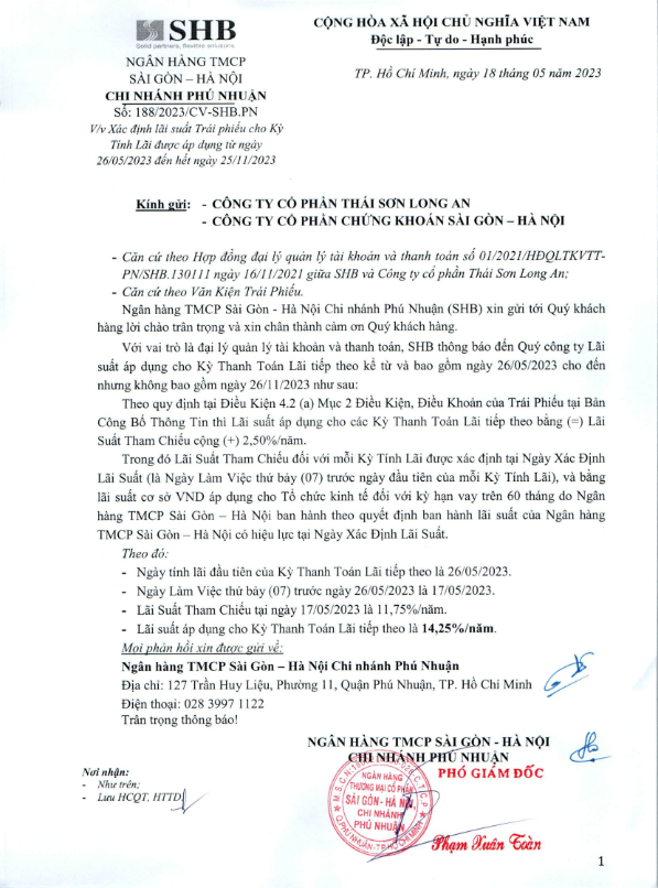 Thông báo lãi suất Trái phiếu CTCP Thái Sơn Long An