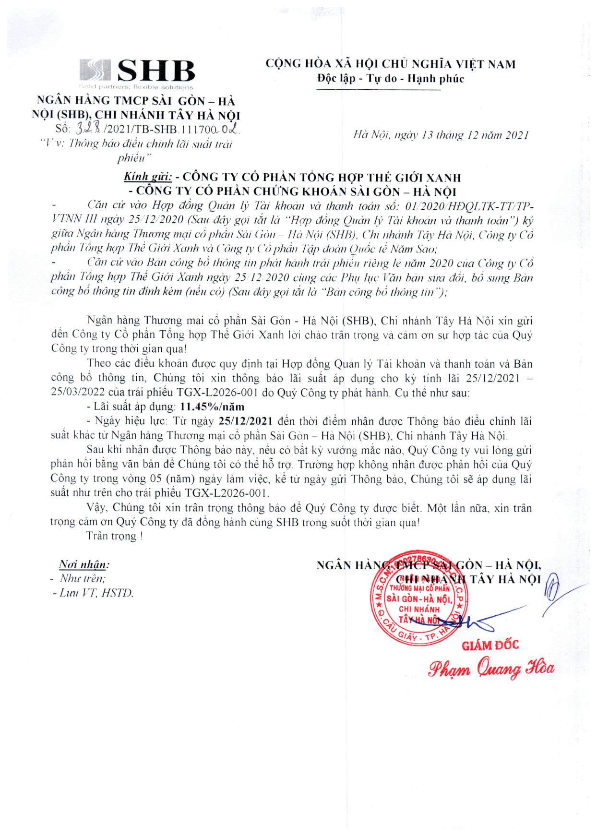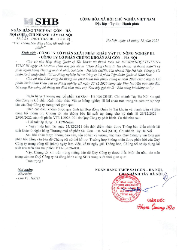 Thông báo Lãi suất Trái phiếu CTCP XNK Vật Tư Nông Nghiệp III và CTCP Tổng hợp Thế Giới Xanh từ 25/12/2021 cho đến khi có thông báo khác của SHB CN Tây Hà Nội CTCP XNK Vật Tư Nông Nghiệp III và CTCP Tổng hợp Thế Giới Xanh