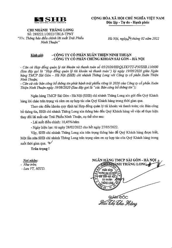 - Thông báo lãi suất Trái phiếu CTCP Xuân Thiện Thuận Bắc từ 28/02/2022 đến 27/05/2022 - 31/03/2022