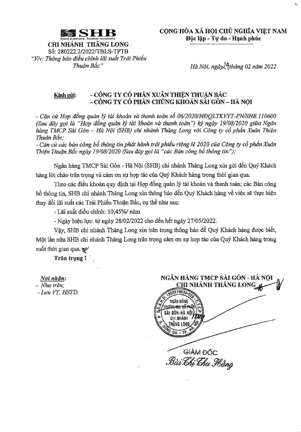 Thông báo lãi suất Trái phiếu CTCP Xuân Thiện Thuận Bắc từ 28/02/2022 đến 27/05/2022