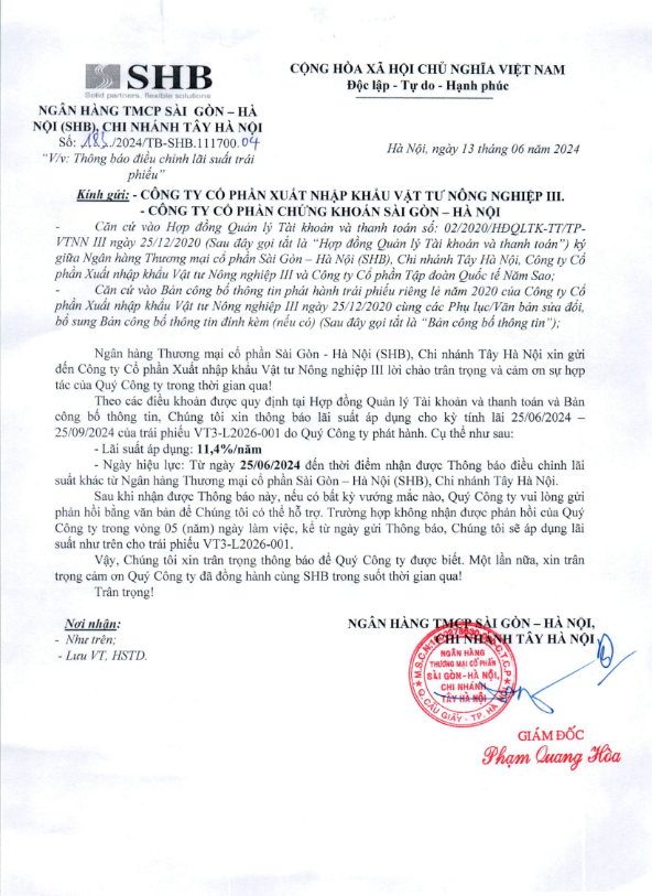 Thông báo lãi suất trái phiếu CTCP Xuất nhập khẩu Vật tư Nông nghiệp III