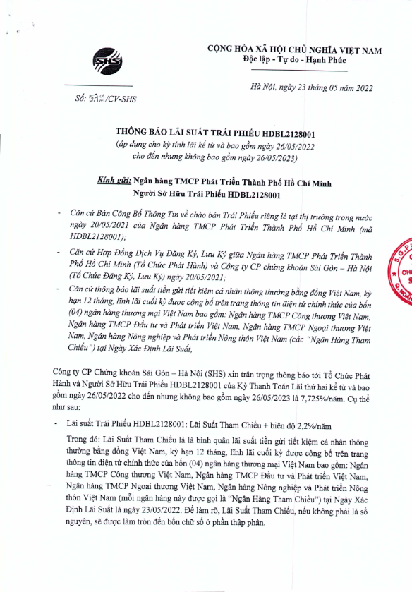 - Thông báo về ngày chốt Danh sách người Sở hữu Trái phiếu để thực hiện trả lãi lần 1 Trái Phiếu SHBH2123003 Ngân hàng TMCP Sài Gòn - Hà Nội - 24/05/2022