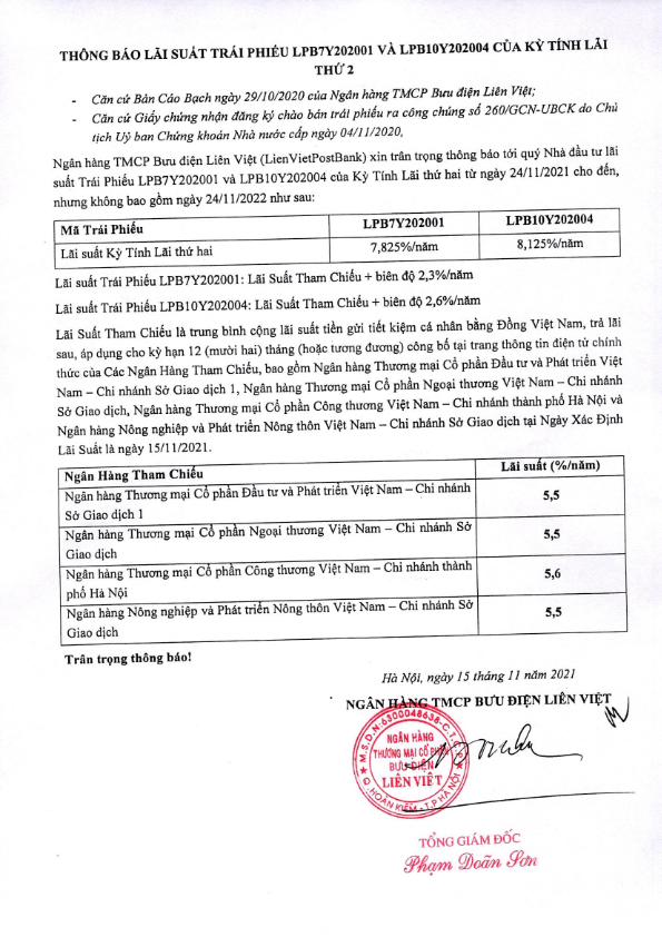 Thông báo Lãi suất Trái phiếu LPB7Y202001 và LPB10Y202004 kỳ tính lãi thứ 2