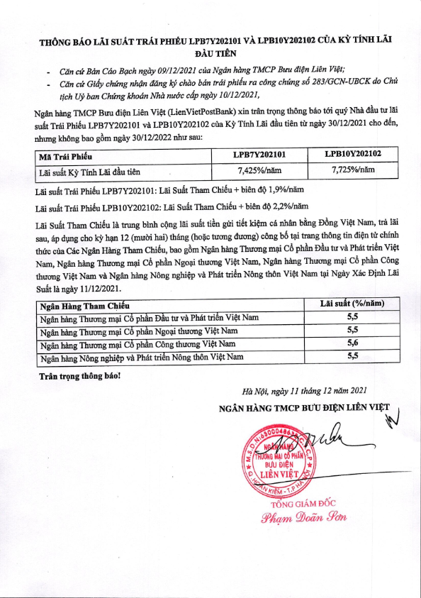 - Thông báo Lãi suất Trái phiếu LPB7Y202002 và LPB10Y202005 kỳ tính lãi thứ 2 phần Ngân hàng TMCP Bưu điện Liên Việt - 13/12/2021