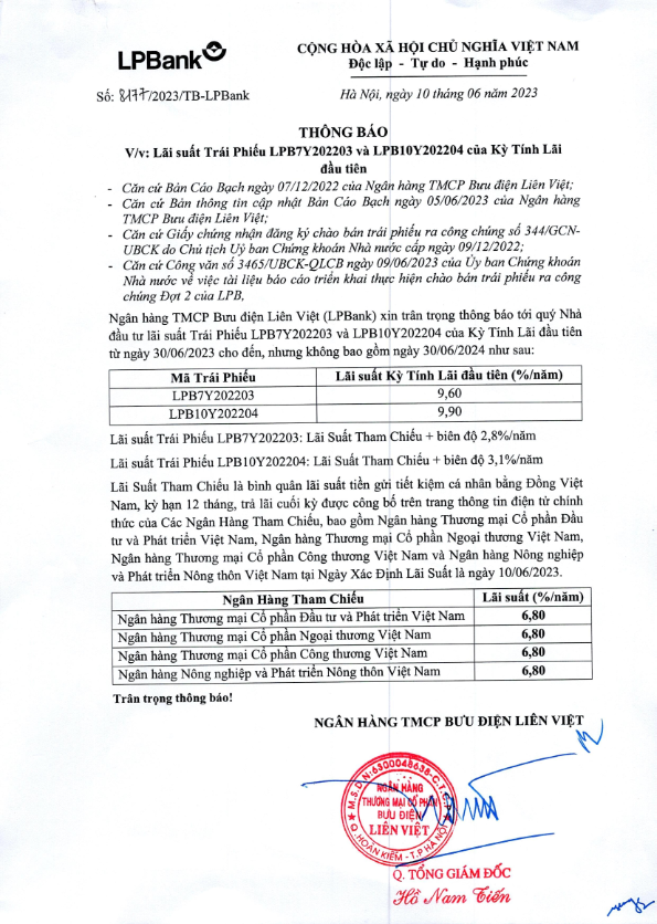 Thông báo lãi suất trái phiếu LPB7Y202203 và LPB10Y202204 của Kỳ Tính lãi đầu tiên Ngân hàng TMCP Bưu điện Liên Việt