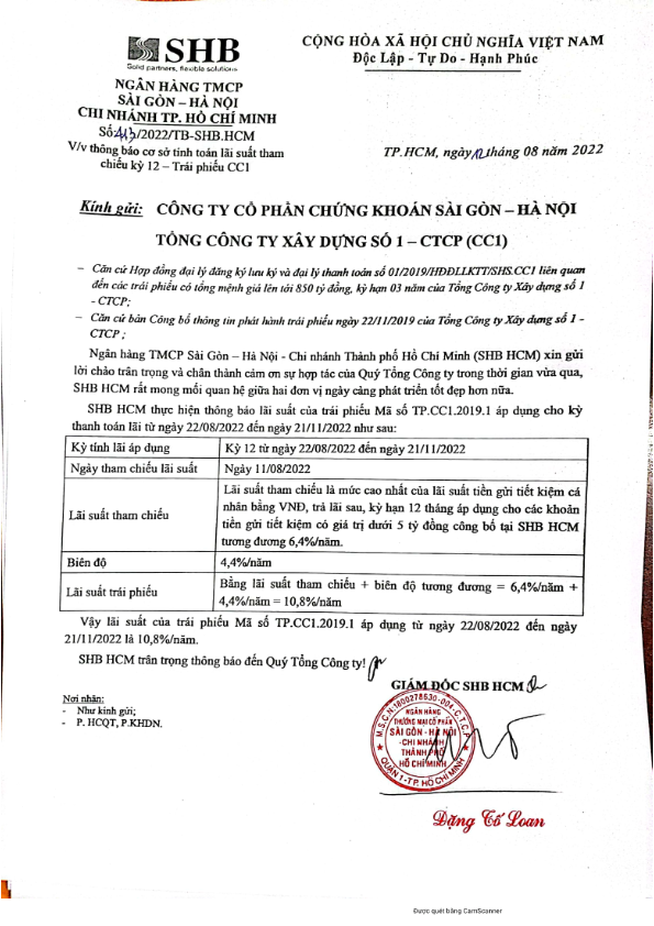 Thông báo lãi suất Trái phiếu Tổng công ty xây dựng số 1 -CTCP