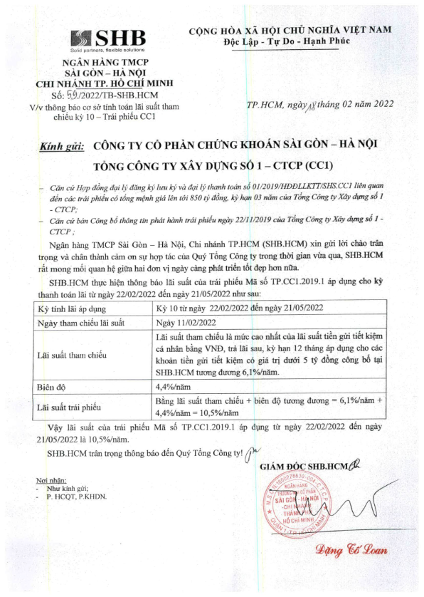 Thông báo lãi suất Trái phiếu Tổng công ty xây dựng số 1- CTCP (CC1) từ ngày 22.02.2022 đến 21.05.2022 phần Tổng công ty xây dựng số 1- CTCP (CC1)
