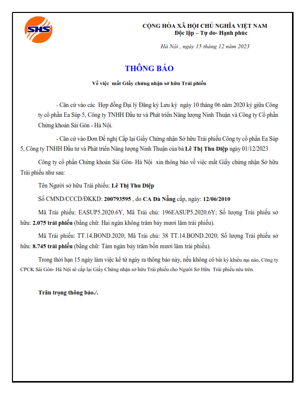 Thông báo mất Giấy CN Sở Hữu Trái Phiếu CÔNG TY CỔ PHẦN EA SÚP 5, Công ty TNHH Đầu tư và Phát triển Năng lượng Ninh Thuận