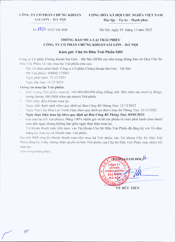 Thông báo mua lại trái phiếu Công ty CPCK Sài Gòn - Hà Nội