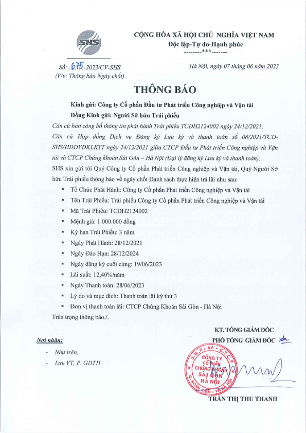 - Thông báo ngày chốt danh sách Người sở hữu Trái Phiếu CTCP Đầu tư và Phát triển Công Nghiệp và Vận Tải (Tracodi);