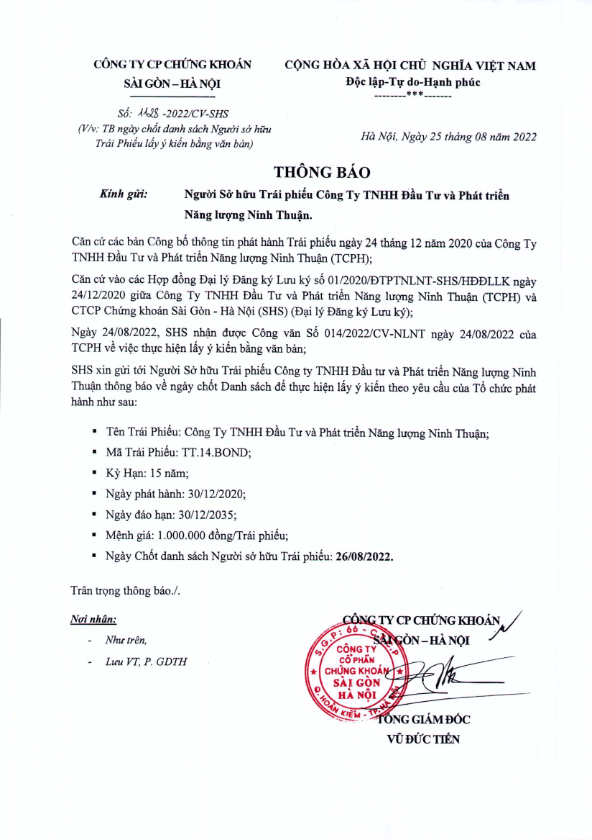 Thông báo ngày chốt Danh sách Người sở hữu Trái Phiếu lấy ý kiến bằng văn bản Công ty TNHH Đầu Tư và Phát triển Năng Lượng Ninh Thuận