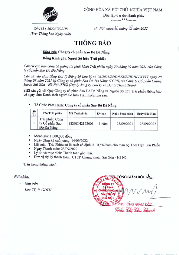 Thông báo ngày chốt Danh sách Người sở hữu Trái phiếu trả lãi và gốc đáo hạn Công ty Cổ phần Sao Đỏ Đà Nẵng