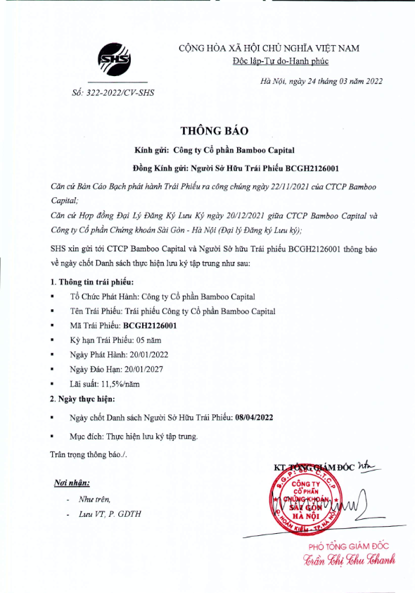 Thông báo ngày chốt danh sách thực hiện đăng ký, lưu ký tập trung Trái phiếu BCGH2126001