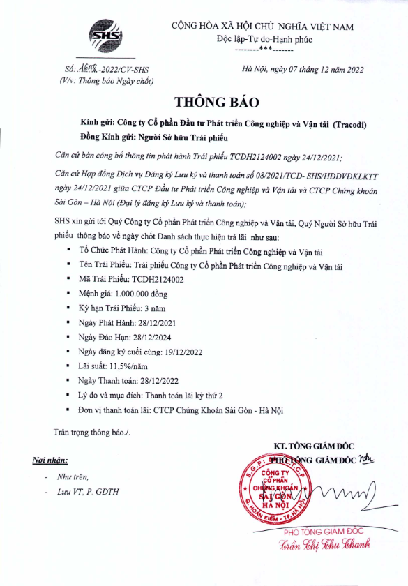 Thông báo Ngày chốt danh sách trả lãi TP CTCP Đầu tư và Phát triển Công Nghiệp và Vận Tải (Tracodi)