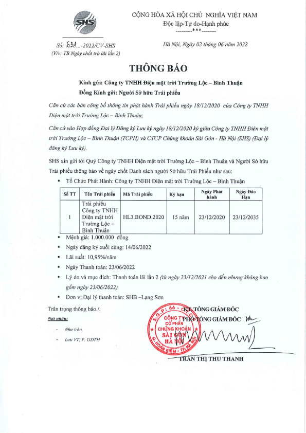 Thông báo ngày chốt trả lãi lần 2 Trái phiếu Công ty TNHH Điện mặt trời Trường Lộc – Bình Thuận