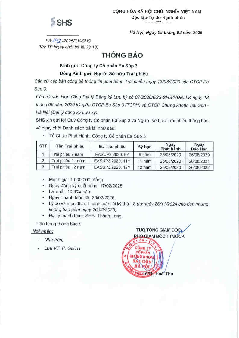 Thông báo ngày chốt trả lãi Trái phiếu Công ty Cổ phần EA SÚP 3