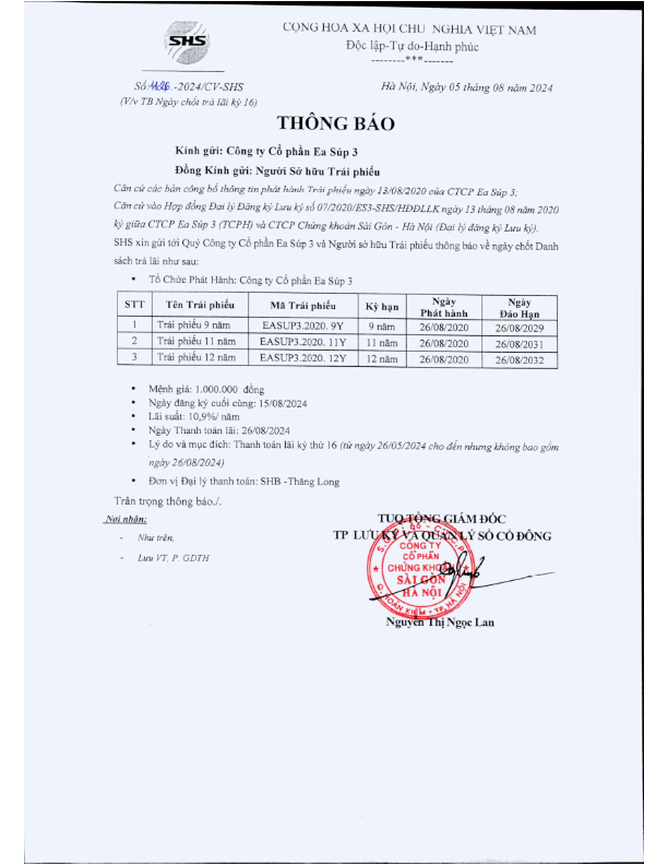 - Thông báo v/v Mua lại trước hạn Trái phiếu CTCP Ea Súp 5 - 30/07/2024
