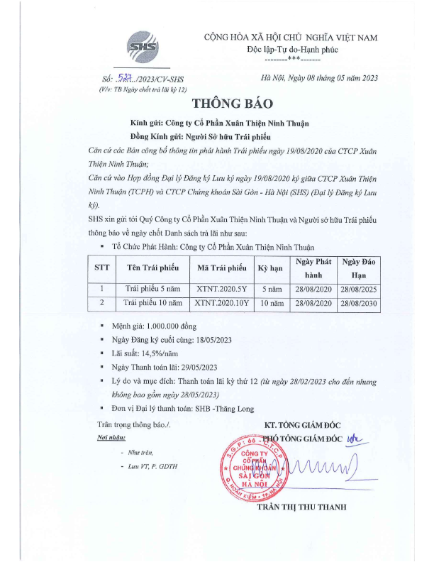 Thông báo ngày chốt trả lãi Trái phiếu XTNT CTCP Xuân Thiện Ninh Thuận