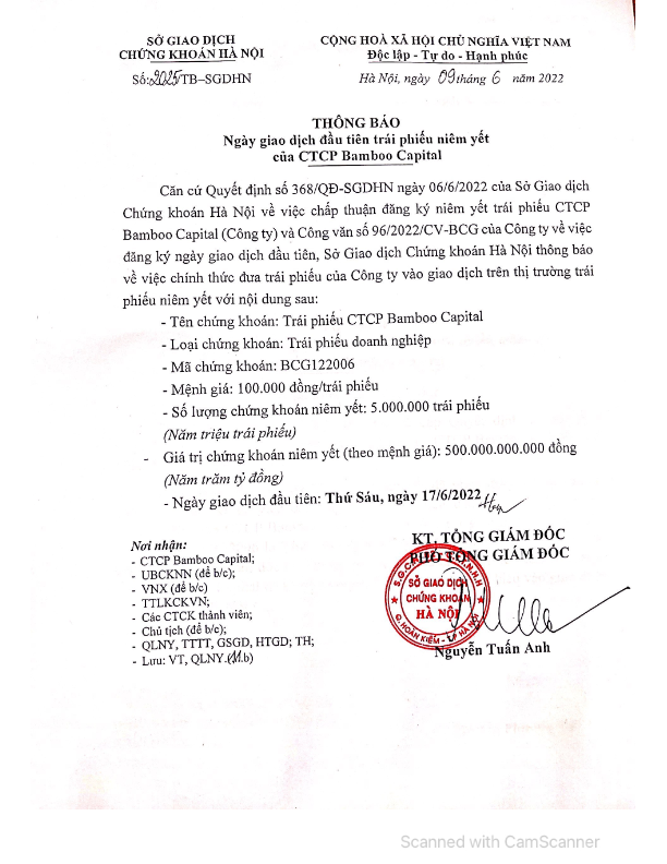 Thông Báo Ngày Giao dịch đầu tiên của Trái phiếu BCG122006