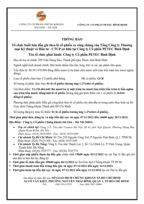 Thông báo tổ chức buổi bán đấu giá theo lô cổ phiếu ra công chúng của TCT Thương mại Kỹ thuật và Đầu tư-CTCP Sở hữu tại CTCP Petec Bình Định