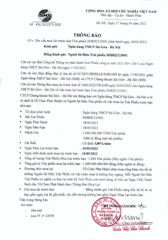 - Thông báo về ngày chốt Danh sách người Sở hữu Trái phiếu để thực hiện trả lãi lần 1 Trái Phiếu SHBH2123002 - 24/04/2022