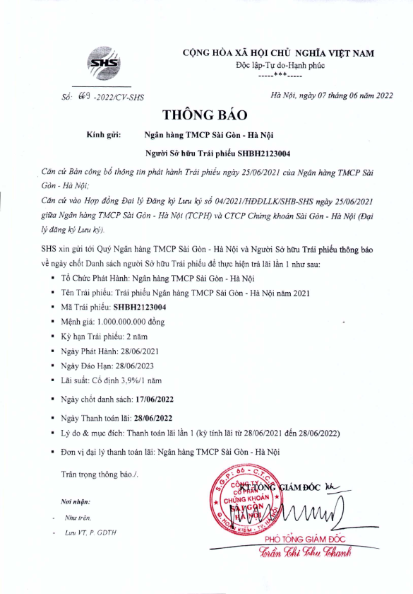 Thông báo về ngày chốt Danh sách người Sở hữu Trái phiếu để thực hiện trả lãi lần 1 Trái Phiếu SHBH2123004 Ngân hàng TMCP Sài Gòn - Hà Nội