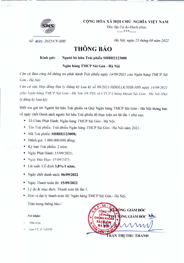 Thông báo về ngày chốt Danh sách người Sở hữu Trái phiếu để thực hiện trả lãi lần 1 Trái Phiếu SHBH2123008 Ngân hàng TMCP Sài Gòn - Hà Nội