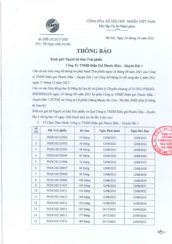 - SHB Thông báo lãi suất kì 2 trái phiếu CTY TNHH Điện Gió Phước Hữu – Duyên Hải 1 - 23/10/2022