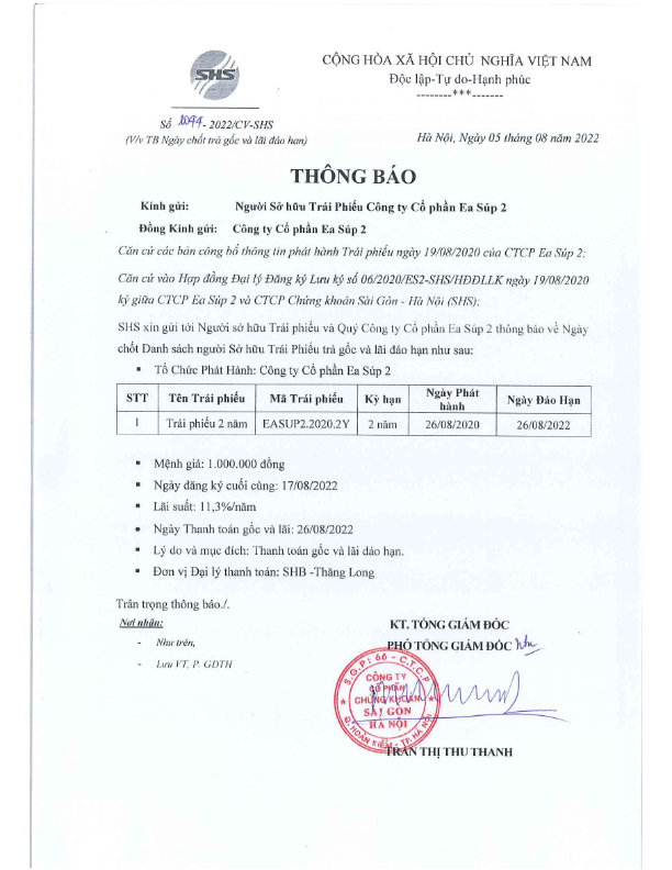 Thông báo về ngày chốt trả gốc và lãi Trái phiếu ES2 kỳ hạn 2 năm CTCP Ea Súp 2