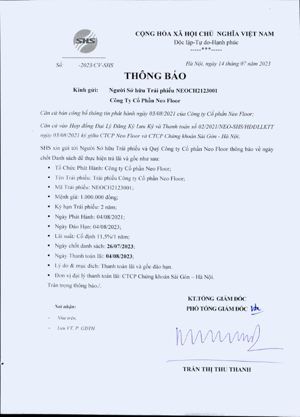 Thông báo về ngày chốt trả lãi +Gốc đáo hạn Trái phiếu Công ty Cổ phần Neo Floor