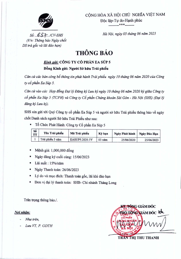 Thông báo về ngày chốt trả lãi +gốc đáo hạnTrái phiếu CÔNG TY CỔ PHẦN EA SÚP 5