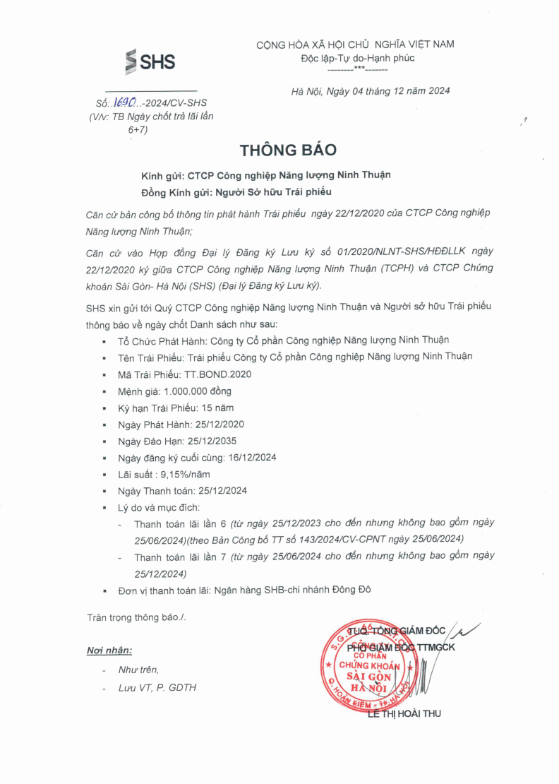 - Thông báo về ngày chốt trả lãi Trái phiếu Công ty TNHH Đầu tư và Phát triển Năng lượng Ninh Thuận - 09/12/2024