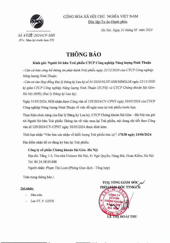 - Thông báo về việc Lấy ý kiến NSHTP Công ty Cổ phần Công nghiệp Năng lượng Ninh Thuận - 30/05/2024