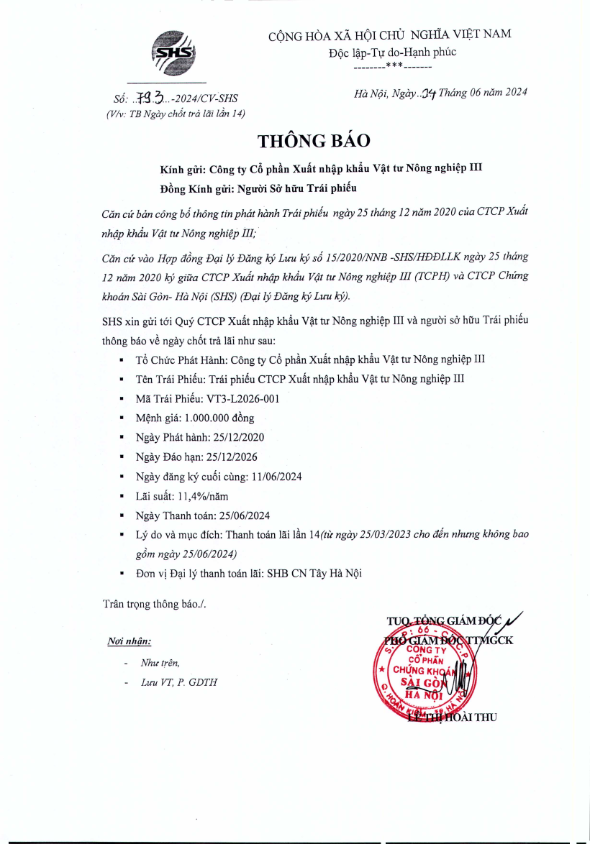 Thông báo về ngày chốt trả lãi Trái phiếu CTCP Xuất nhập khẩu Vật tư Nông nghiệp III
