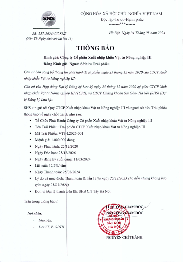 Thông báo về ngày chốt trả lãi Trái phiếu CTCP Xuất nhập khẩu Vật tư Nông nghiệp III