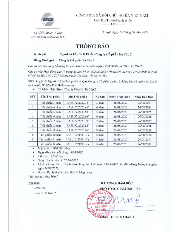 - Thông báo về ngày chốt trả gốc và lãi Trái phiếu ES2 kỳ hạn 2 năm CTCP Ea Súp 2 - 04/08/2022