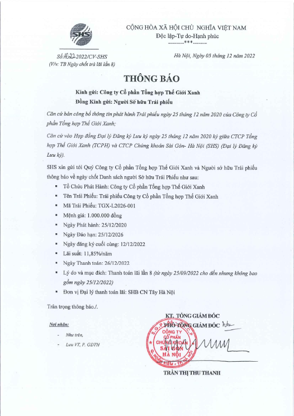 Thông báo về ngày chốt trả lãi Trái phiếu TGX-L2026-001 CTCP Tổng hợp Thế giới Xanh