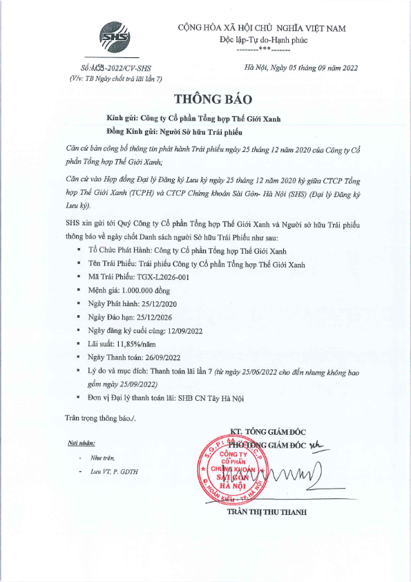 Thông báo về ngày chốt trả lãi Trái phiếu TGX-L2026-001 CTCP Tổng hợp Thế giới Xanh