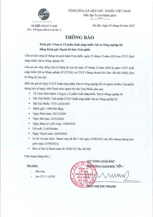 Thông báo về ngày chốt trả lãi Trái phiếu VT3-L2026-001 CTCP Xuất nhập khẩu Vật tư Nông nghiệp III