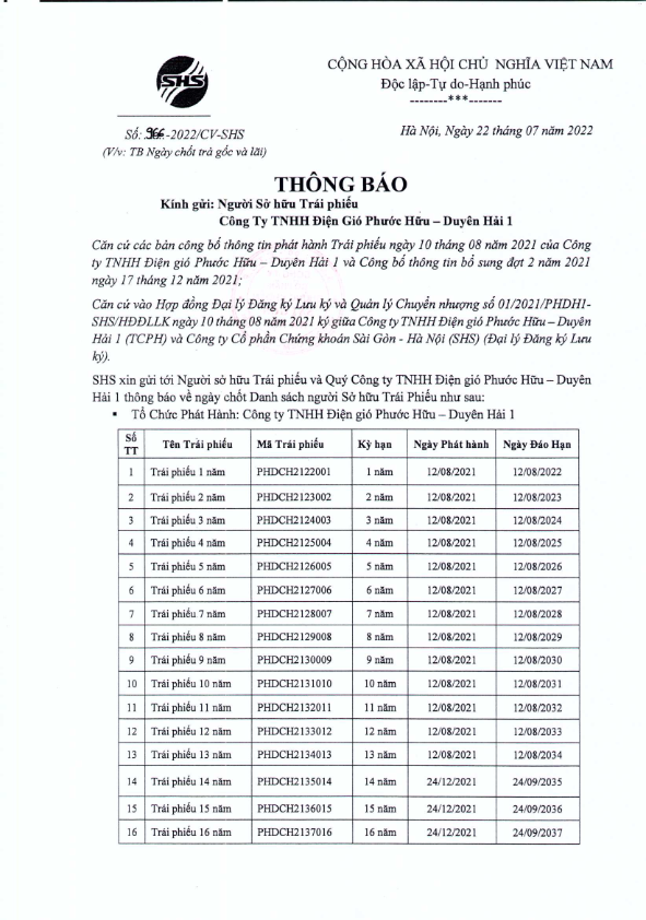 Thông báo về ngày chốt trả trả gốc/lãi Trái phiếu CTY TNHH Điện Gió Phước Hữu – Duyên Hải 1 (Các kỳ hạn 1 – 16 năm)