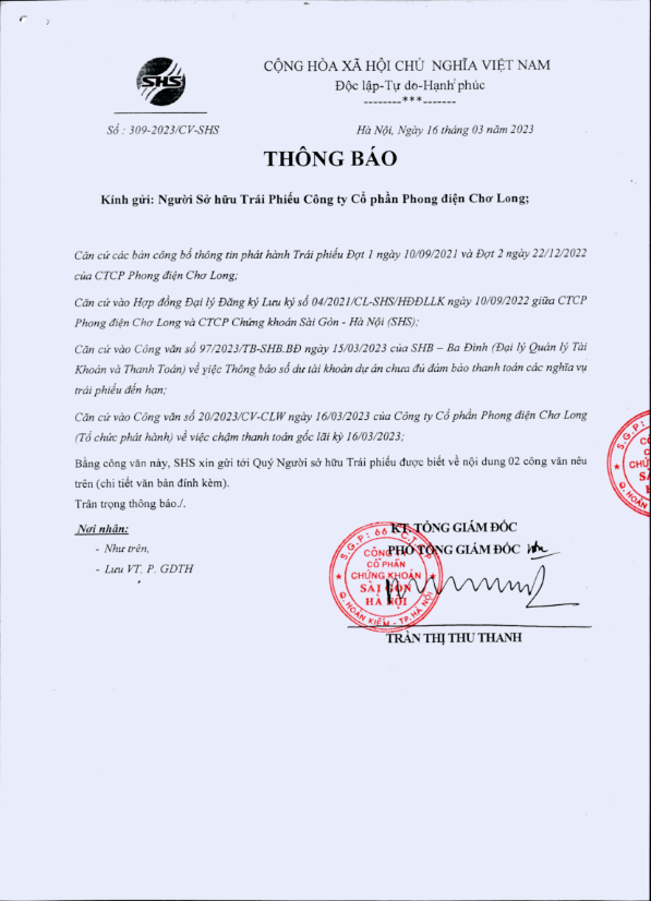 Thông báo Về việc chậm thanh toán gốc lãi kỳ 3 ngày 16/03/2023 Trái Phiếu Công ty Cổ phần Phong điện Yang Trung