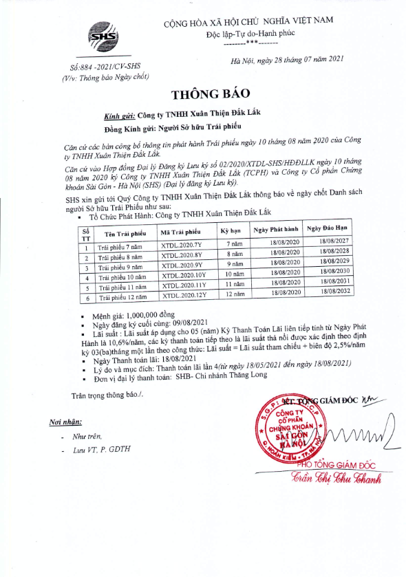 Thông báo Về việc chốt danh sách Người sở hữu Trái phiếu để thực hiện Trả lãi kỳ 4 cho Công ty TNHH Xuân Thiện Đắk Lắk