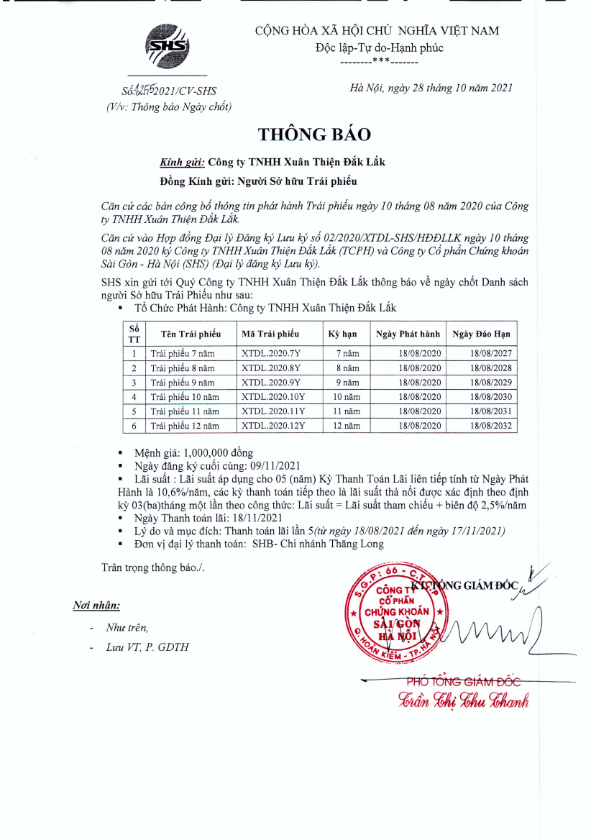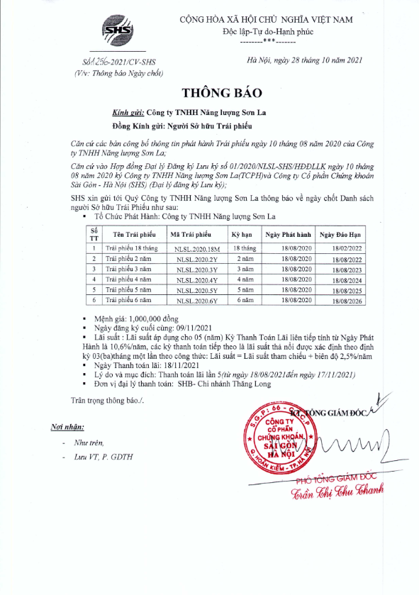 Thông báo Về việc chốt danh sách Người sở hữu Trái phiếu để thực hiện Trả lãi kỳ 5 cho Công ty TNHH Năng Lượng Sơn La và Công ty TNHH Xuân Thiện Đắk Lắk