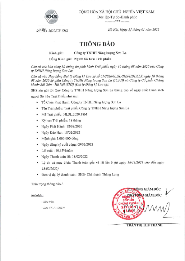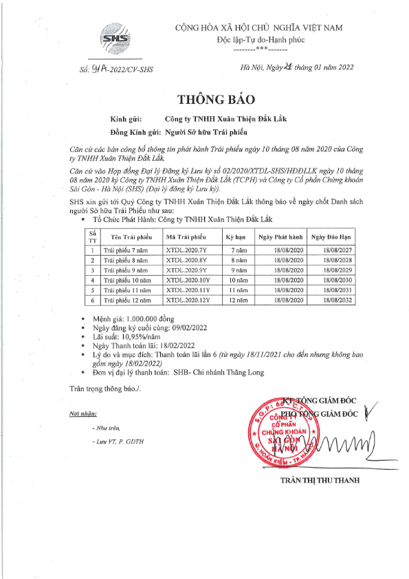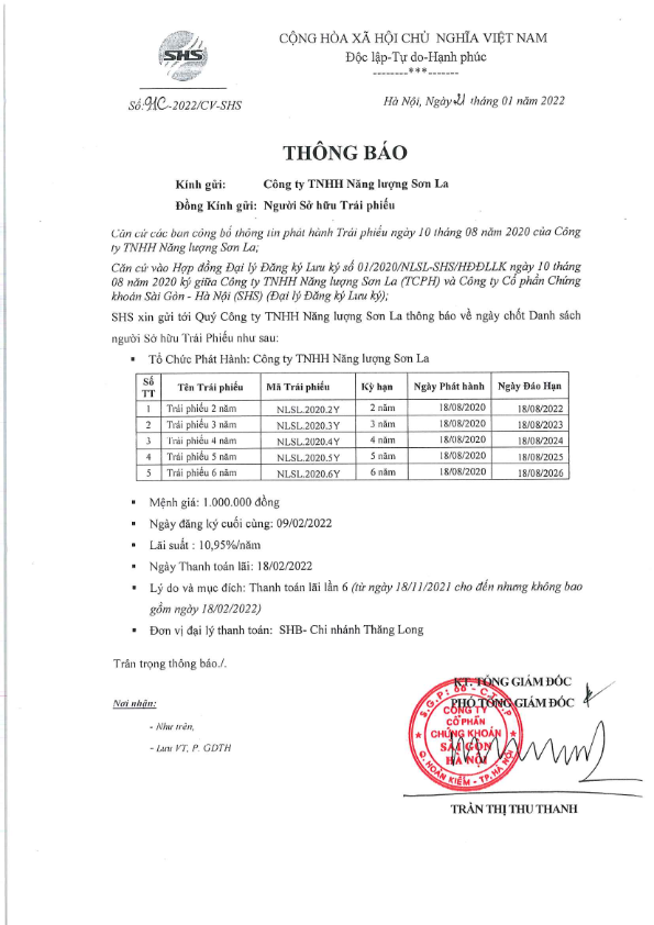 Thông báo Về việc chốt danh sách Người sở hữu Trái phiếu để thực hiện Trả lãi kỳ 6 cho Công ty TNHH Năng Lượng Sơn La và Công ty TNHH Xuân Thiện Đắk Lắk