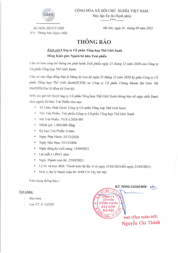 Thông báo Về việc chốt danh sách Người sở hữu Trái phiếu để thực hiện trả lãi TP CTCP Tổng hợp Thế Giới Xanh
