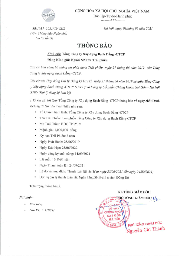 Thông báo Về việc chốt danh sách Người sở hữu Trái phiếu để thực hiện trả lãi TP Tổng Công ty Xây dựng Bạch Đằng-CTCP
